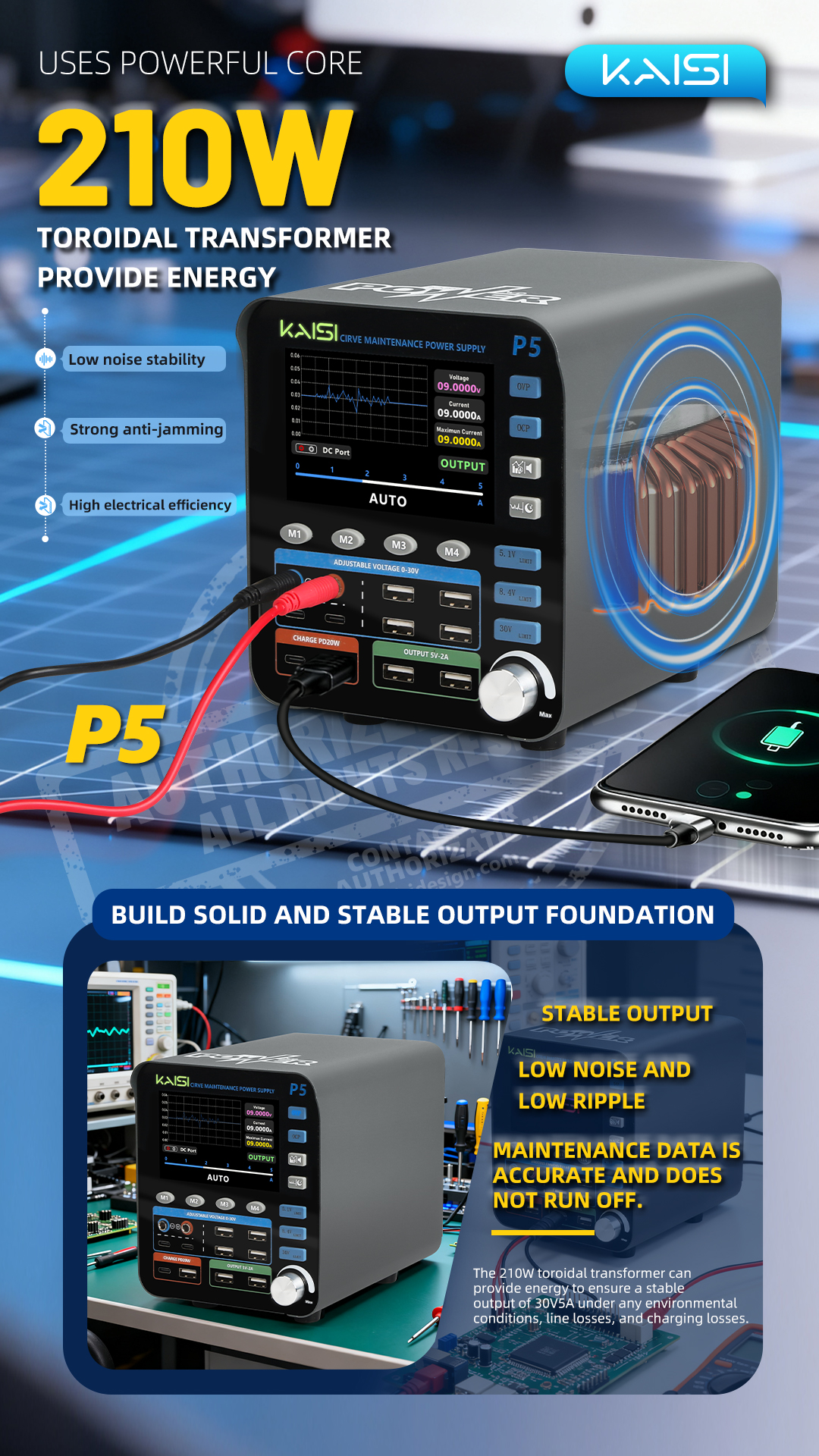 1. 210W toroidal transformer, ensuring a stable output of 30V/5A, with anti-loss and no derating.